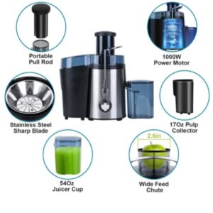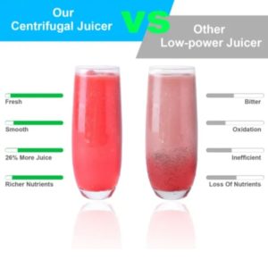 Brand:Overview: With a 1000W powerful motor and stainless steel sharp blade, our centrifugal juicer efficiently extracts up to 26% more juice and 36% vitamins and minerals, which ensures a high juice yield.