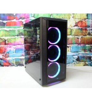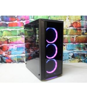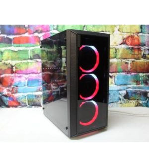 Brand:Nvidia Geforce GTX 660 2 GB GDDR5. Custom black Raidmax mini tower entry level gaming PC with side tempered glass door and 3 front ring ARGB LED and 1 rear black 120 mm case fan. Front RGB lights can change patterns and colors by pressing the LED button at the top of the case.