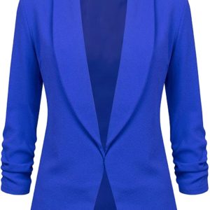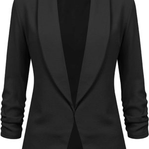 Brand:93% Polyester, 7% SpandexImportedWarm IronWomen’s Shawl Collar Casual Work Office Blazer Cardigan Jacket3/4 length Ruched sleeves Open Front Blazer / Pull On closureThey are really soft and flexible, but they still have great structure. You can wear these to work and look professional.Machine washable. Washing max 30?, Hang Dry, Low ironA variety of occasions for you to wear like casual, work or office. Great for all season