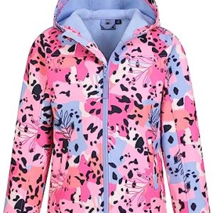 CAMLAKEE Girls Waterproof Jackets Kids Raincoats FLeece Lined Printed Hooded Coat Outdoor Windbreaker Pink UK:7-8 years (manufacturers's size: 130)