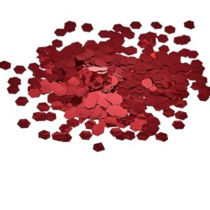 Red Cosmetic glitter for use on the eyes, lips, face, body, hair and nails.