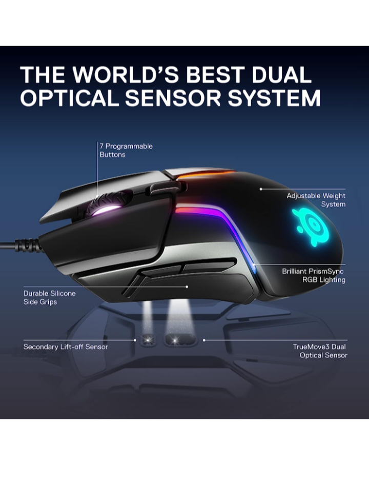 – 12,000 CPI TrueMove3Plus Dual Optical Sensor – 0.5 Lift-off Distance – Weight System – RGB Lighting
