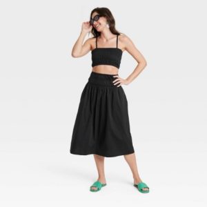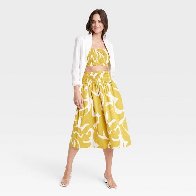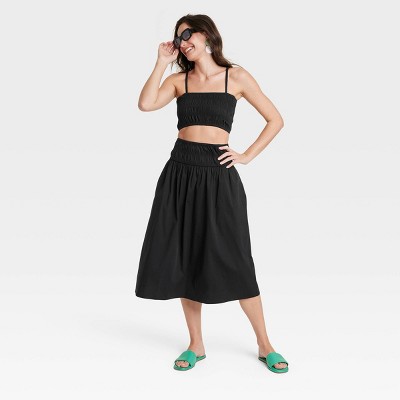 Brand:•Smocked midi A-line skirt •Cotton fabric with stretch •Full elastic waistband •Side pockets Description Dress up your look for casual outings with this Smocked Midi A-Line Skirt from A New Day. This A-line skirt in a midi length features a smocked finish on the wide elastic waist for a touch of textured style. The lightweight cotton material with stretch offers comfy wear, while the two side pockets add functional flair.